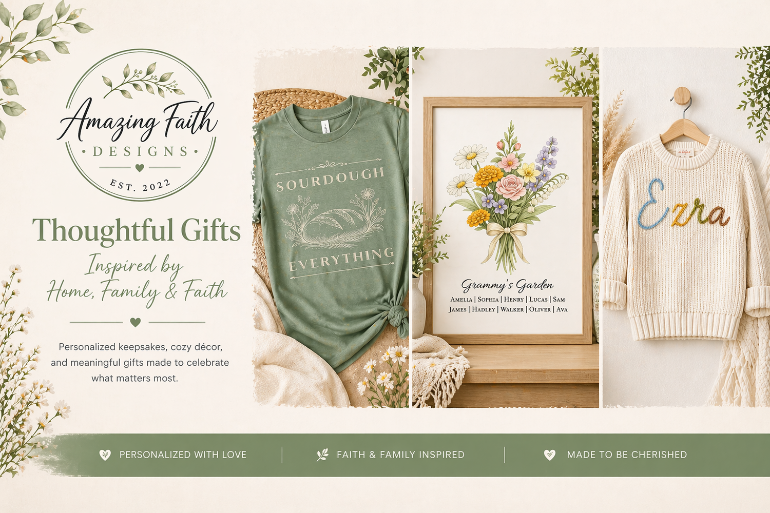 Welcome to Amazing Faith Designs — a cozy boutique of faith-inspired gifts, sourdough apparel, personalized keepsakes, watercolor artwork, and meaningful handmade home decor. From bread lovers to faith-filled homes, every piece is created with warmth, joy, and everyday grace.