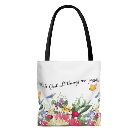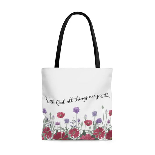 With God All Things Are Possible Red Flower Scripture Tote Bag